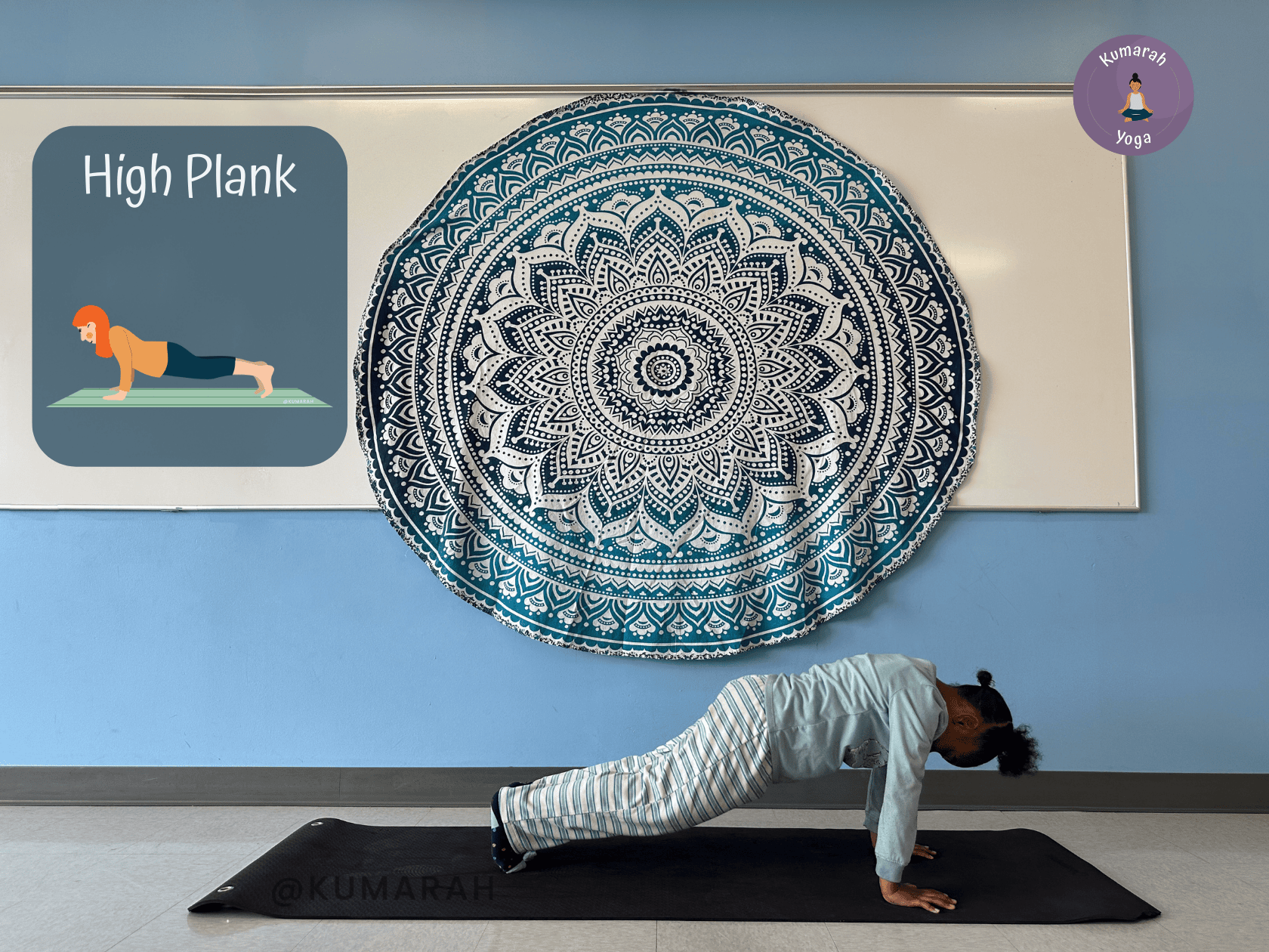 One of the goals with kindergarten kids in yoga is, of course, to help them learn some mindfulness and self control. Just by practicing yoga poses and becoming aware of their bodies relative to space, you will be helping them achieve part of this.