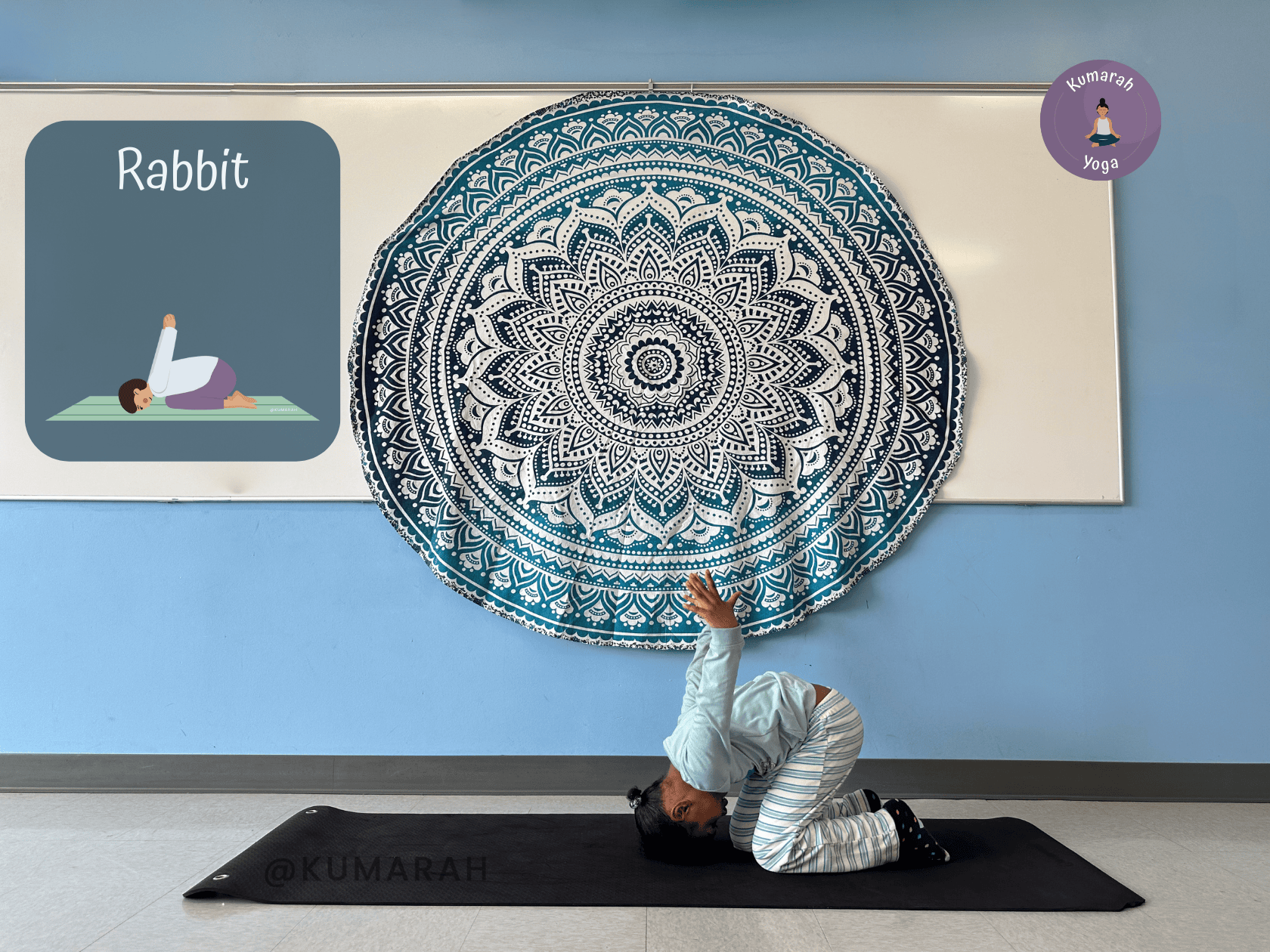 Keep consistency in the outline of your yoga session as well, like a Yoga Flow to get them started and moving, a breathing exercise, and then a yoga story. End with a meditation or at least a “resting pose”.