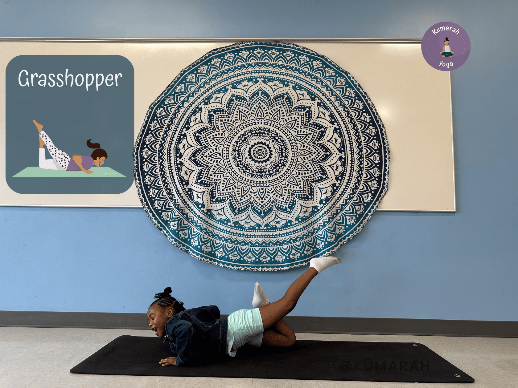 Now it’s time for the core of the class — bug yoga poses! Each pose below pairs a real yoga shape with a bug-themed twist — perfect for keeping kids engaged and imaginative.