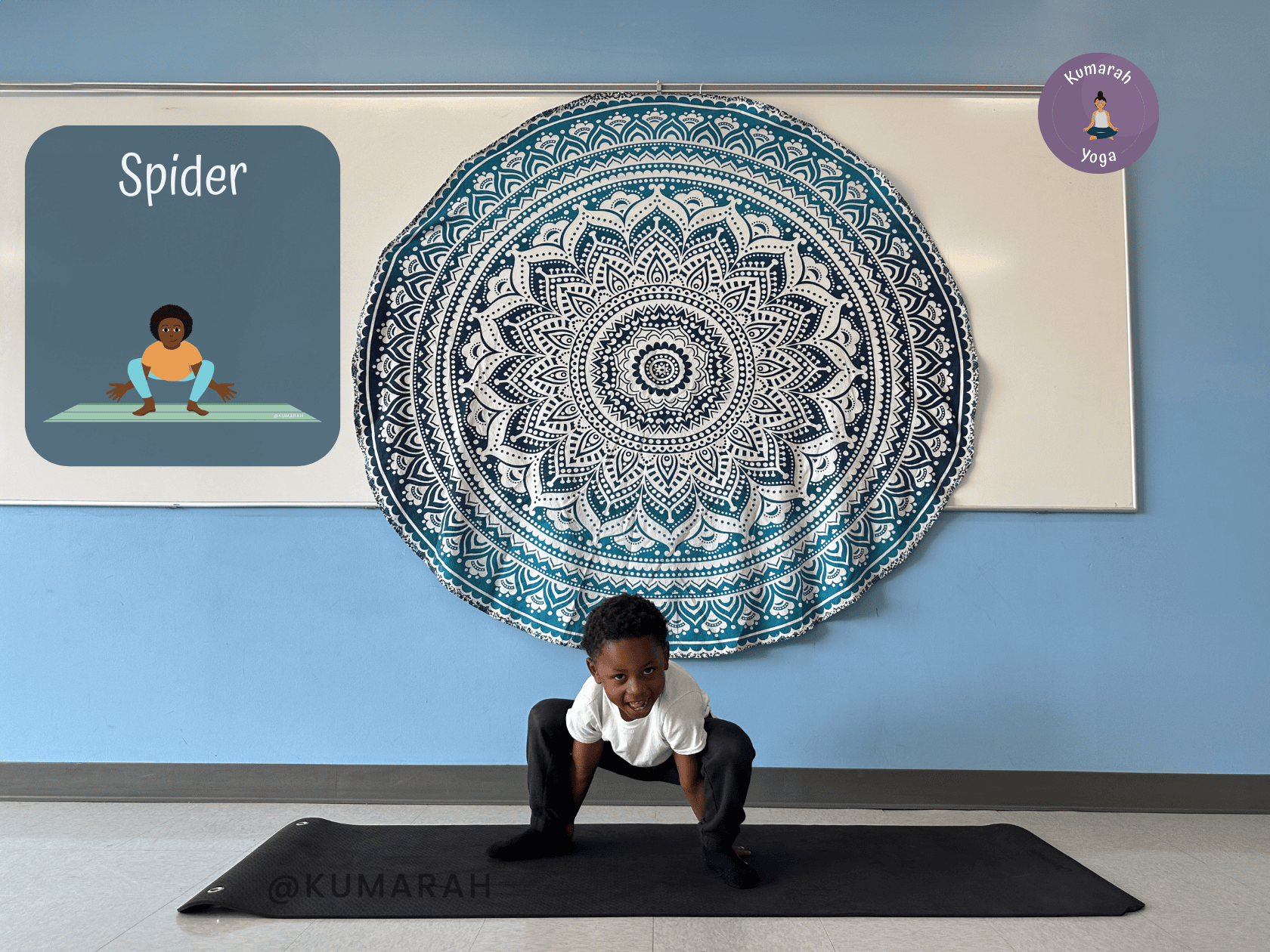 Spiders Pose is a choice between two options. Either a sitting position with knees bent and feet flat on the floor, and tucking your arms under your bent knees with hands out to the sides. This creates a wide shape with your arms and legs to mimic a spider’s eight legs. Some kiddos like to try this from a squat position, weaving their hands inside the knees and out behind their legs. It feels very silly!