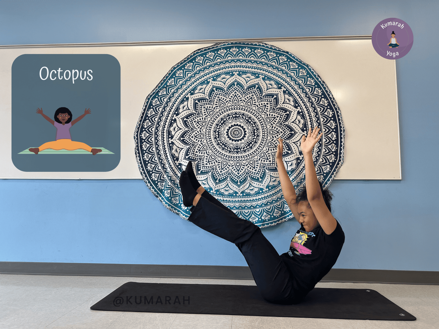 - Octopus (Octopus Pose): Sit back on your seat, lift your legs, and wiggle all your arms and legs around like flowing tentacles.