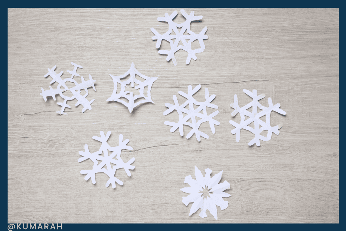 Craft time! Make snowflakes by cutting patterns in different types of material: white paper, coffee filters, tissue paper, contact paper, doily, wax paper, etc.